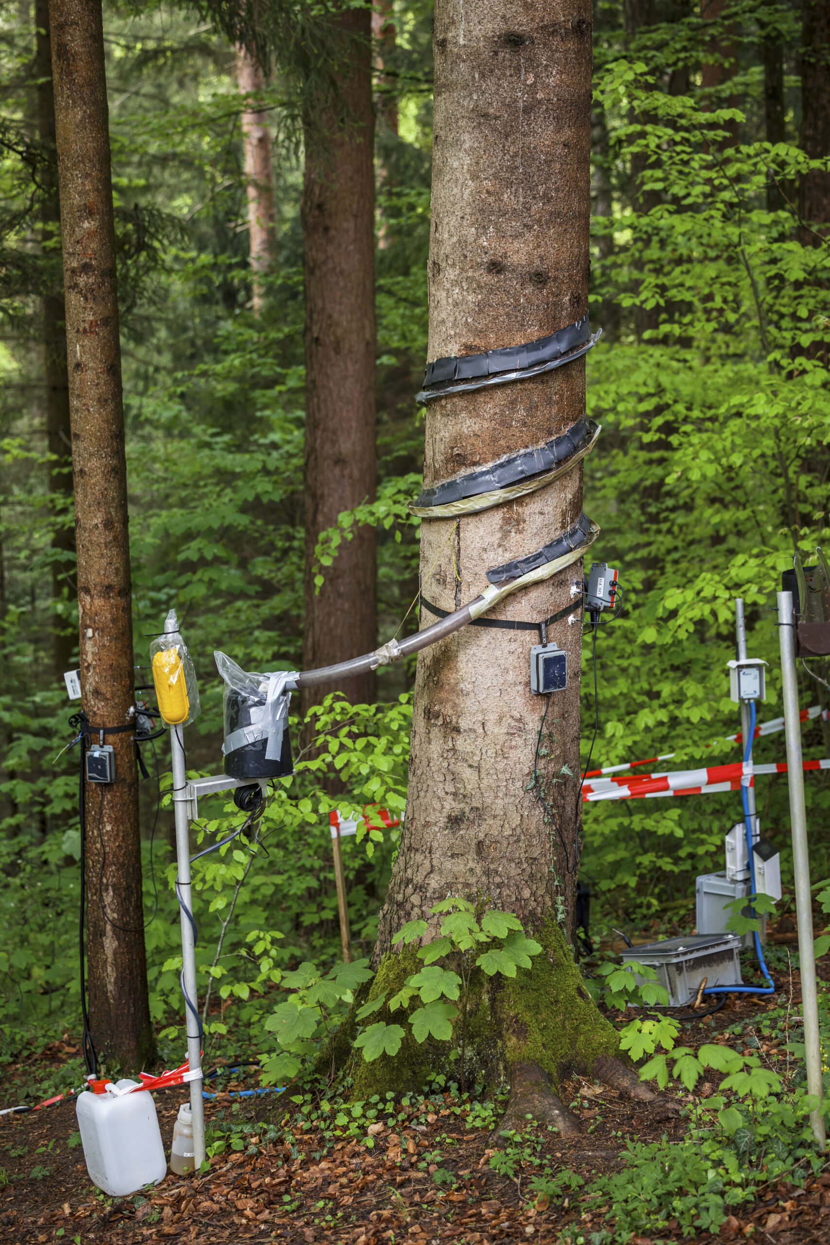 At the WaldLab Forest Experimental Site, researchers monitor water dynamics across the soil-plant-atmosphere continuum. The objective is to observe the quantity and chemical composition of all water fluxes across the forest water cycle, to better understand the dominant processes of water transport and mixing. The research focuses on analysing how forests influence the water cycle, where trees source water for transpiration and how they adapt to dry spells.